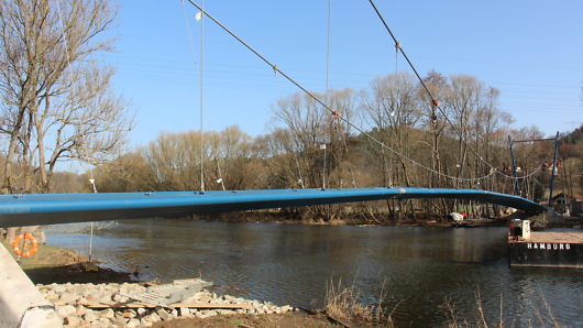 Die neue Bohlenwandbrücke sollen zu Pfingsten die ersten Radfahrer und Fußgänger überqueren können. Verbunden mit der Freigabe soll eine offizielle Namensgebung erfolgen.